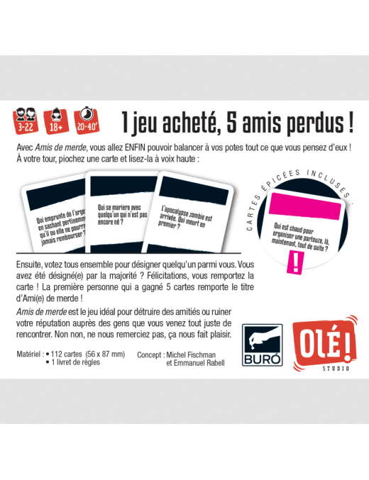 Amis de merde est le jeu parfait pour briser des amitiés de longue date, gâcher une réunion de famille, semer la zizanie dans les couples ou ruiner toute chance de faire bonne impression auprès de quelquun que vous venez de rencontrer.