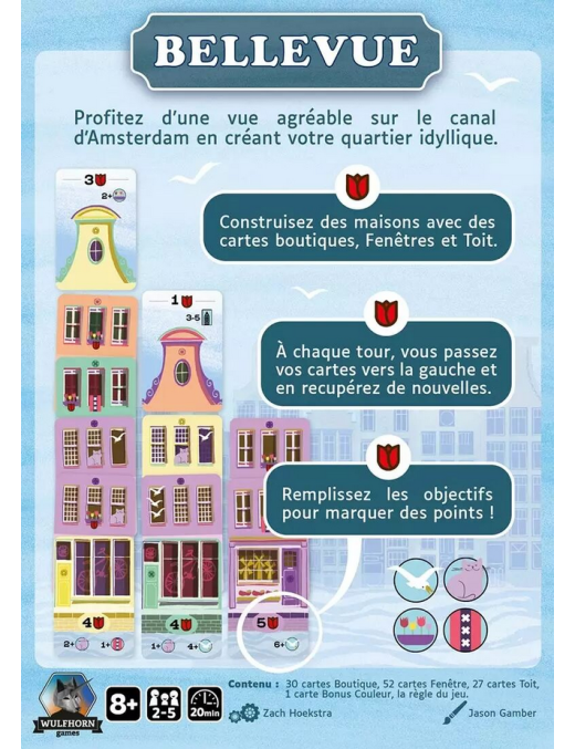 Bellevue est un jeu de pose de cartes agréable dans lequel vous créez votre rue en construisant des maisons darchitecture flamande typique sur le canal dAmsterdam. Choisissez la meilleure carte de votre main à poser avant de les passer à vos adversaires. Vous devrez réaliser les objectifs de vos Boutiques et de vos Toits, tout en gardant un il sur les couleurs afin de marquer le plus de points et de remporter la victoire !