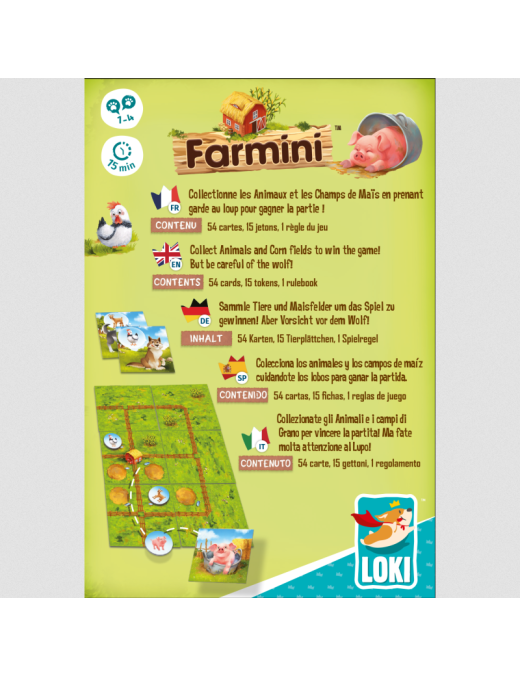 Le trophée de la plus belle ferme de lannée sera remis à la ferme regroupant le plus danimaux et de champs de maïs ! Seras-tu le grand gagnant de ce concours ? Dans Farmini, chacun a face à lui une ferme quil va devoir agrandir. Tour à tour, pioche une carte parmi les 4 qui se trouvent au centre de la table. Si cest une carte Enclos : à la façon des dominos, dépose cette nouvelle carte dans ta ferme en faisant correspondre les barrières.