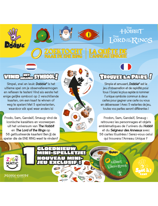 Avec Dobble Le Seigneur des anneaux - Le Hobbit, repérez le seul symbole identique entre deux cartes et soyez le plus rapide à scorer ! Tous les éléments et personnages emblématiques de l'oeuvre de J.R.R Tolkien (repris dans les films) sont présents dans ce jeu d'observation où s'affrontent petits et grands. Soyez encore plus observateur que l'Oeil de Sauron pour repérer les Hobbits et leurs compagnons sur les cartes rondes. Laissez ensuite votre rapidité et vos réflexes vous mener jusqu'à la Victoire !