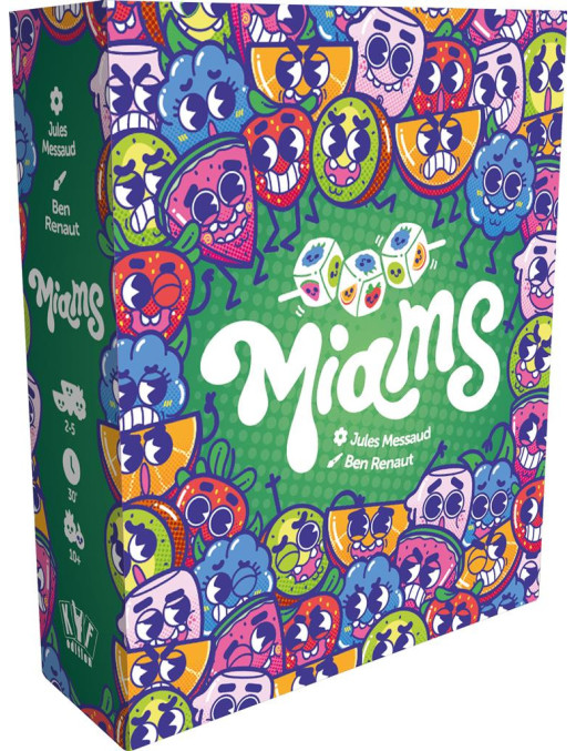 Miams est un jeu de dés survitaminé pour toute la famille dès 10 ans. Lancez vos dés, composez des combinaisons de fruits (paire, brelan, full, carré, suite ou miams), puis cochez les cases de votre feuille pour marquer des points et des bonus.