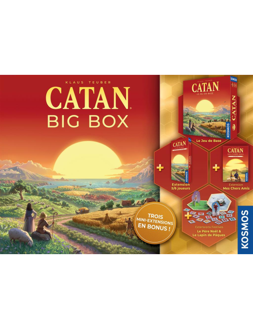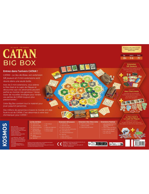 Entrez dans l'univers CATAN ! CATAN - Le Jeu de Base, son extension 5/6 joueurs et 3 mini extensions sont réunis dans une seule boîte grâce à cette édition spéciale. Venez tester de nouvelles stratégies pour rendre vos parties de CATAN toujours plus passionnantes ! Un coffret riche en contenus, idéal à offrir en cadeau.