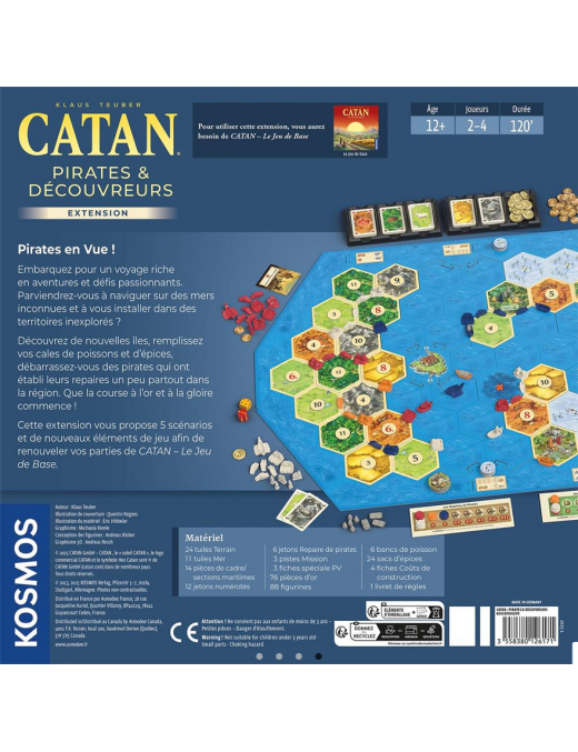 Avec CATAN Pirates & Découvreurs, prenez le large ! Dans cette extension, vos expéditions prennent une nouvelle dimension : navigateurs, vous partez explorer des mers inconnues, découvrir des terres riches en ressources et affronter de redoutables repaires de pirates.