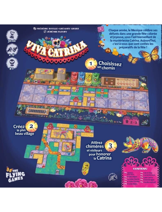 Dans le jeu Viva Catrina, vous incarnez les maîtres de cérémonie du Día de los Muertos et devez organiser une fête somptueuse en l'honneur des défunts. Dans ce jeu de société coloré et stratégique, chaque joueur bâtit son village à laide de tuiles Chemin, dans le but dattirer chimères, visiteurs, papillons et de libérer des envolées de ballons. Chaque décision de placement compte pour optimiser vos connexions et marquer un maximum de points tout en célébrant dignement la Catrina.