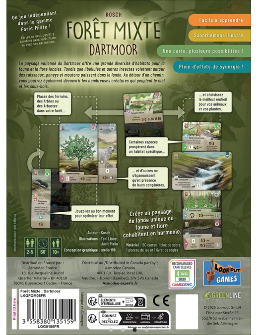 Forêt Mixte : Dartmoor vous fait voyager dans les collines brumeuses du sud-ouest de lAngleterre pour créer un écosystème riche et harmonieux. Dans ce jeu de cartes stratégique, composez votre forêt en y ajoutant arbres, terrains et espèces locales, en respectant leurs besoins spécifiques et leurs