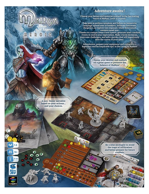 Malhya - Lands of Legends est le projet le plus titanesque du studio 4Univers et de La Boite de Jeu. Il vous propose une aventure narrative coopérative de plus de 100 heures, à travers une campagne de 9 scénarios. Autour d'une mécanique de "livre dont vous êtes le héros", ce sont bel et bien VOS choix qui vous feront avancer à chaque embranchement de l'histoire. De plus, dans ce jeu, un e?chec nest pas une fin, cest seulement une autre voie pour avancer sur le chemin de votre aventure. Il ne sera jamais question de recommencer depuis le début.