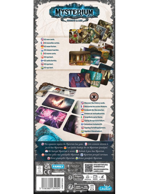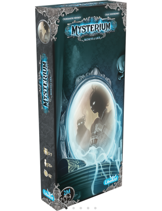 Dans l'extension "Secrets & Lies" (Secrets et Mensonges) découvrez encore plus de cartes inédites pour renouveler vos parties de Mysterium. 6 personnages, 6 lieux et 6 objets inédits viendront renforcer la liste des options possibles. Le fantôme pourra communiquer sur son triste destin grâce à 42