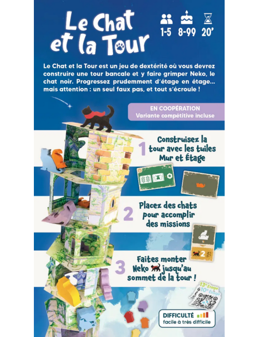 En coopération, construisez la tour à laide de tuiles Mur et Étage, et accomplissez des missions pour aider Neko, le chat noir, à atteindre le sommet de la tour.