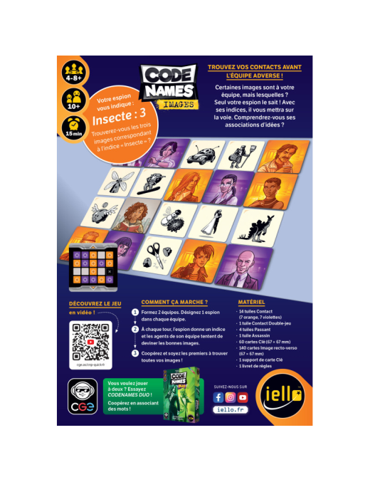 Codenames Images est un jeu dassociation didées fondé sur des images au fort pouvoir évocateur, pour 2 à 8 joueurs (et plus). Répartis en deux équipes, les participants endossent le rôle de Maître-Espion ou dAgent.