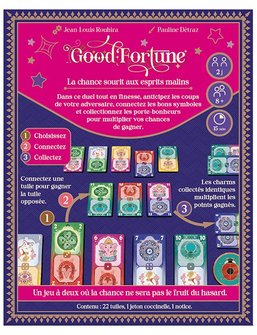 Dans ce duel tout en finesse, anticipez les coups de votre adversaire, connectez les bons symboles et collectionnez les porte-bonheurs pour multiplier vos chances de gagner !