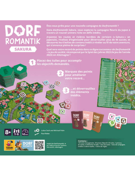 Retrouvez tout le plaisir de jeu de Dorfromantik, le jeu de société transposé dans le Japon ancien. Réalisez votre campagne, seul ou en équipe afin de débloquer les nombreux nouveaux contenus adapté au thème des cerisiers japonais, les Sakuras. De nombreuses surprises vous attendent!
